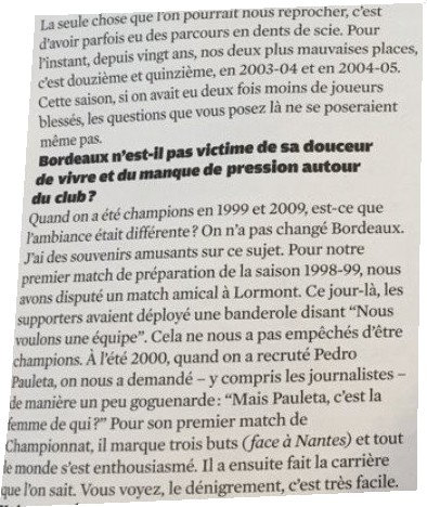 Dugarry ? On n’est pas loin d’être dans le syllogisme. Mais chacun a le droit d’avoir un point de vue. Depuis 2010, je rappelle quand même qu’on a gagné une Coupe de France, en 2013… Depuis 2010, on a aussi disputé trois fois la Ligue Europa. Beaucoup de clubs aimeraient être à notre place. On peut toujours rêver mieux, mais je suis étonné. De 1937 à 1984, les Girondins avaient remporté un seul titre de champion, en 1950. Bordeaux est parmi les plus grands clubs de France depuis la période Bez (trois titres, en 84, 85 et 87) et grâce à M6 (deux titres, en 99 et 2009). C’est assez récent. Et je n’ai pas l’impression que notre période, avec M6, ait été si négative. »