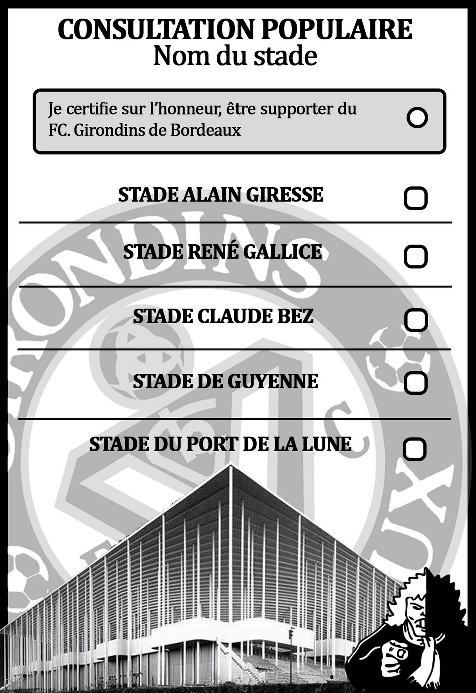 Pour rappel, ce vote aura lieu le samedi 26 septembre, au Virage Sud du nouveau stade, à l’occasion du match Bordeaux – Lyon. Des « bureaux de vote » seront ainsi aménagés et seront accessibles à tous dans les coursives. Il vous faudra donc remplir les « urnes » avec ce bulletin, imprimé et complété comme il se doit selon votre choix.