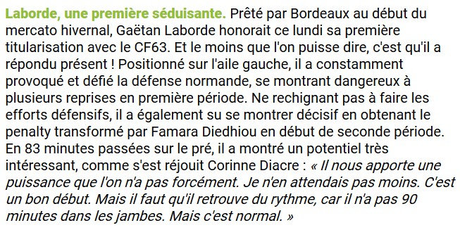 Très en vue pour sa première titularisation avec Clermont (Ligue 2), où il est prêté par Bordeaux, l’ailier gauche Gaêtan Laborde (21 ans) est cité dans les tops par Sports-Auvergne et déjà vanté par Corinne Diacre, la coach de l’actuel 3ème de deuxième division.