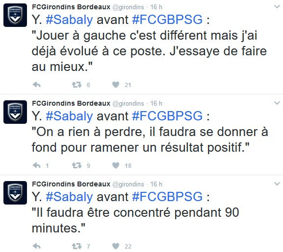 « Je n’appréhende pas ce match. Dans la tête je suis à fond avec les Girondins .Je me sens très bien ici. (…) A un moment, il faudra que je me stabilise. Je suis venu aux Girondins pour franchir un palier et je me sens très bien ici. »