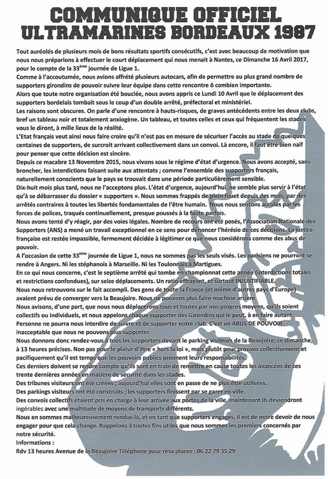 Les UB 87 ont ainsi publié un communiqué indiquant leur volonté de quand même aller à Nantes, devant le stade, afin de manifester pacifiquement pour prouver l’incongruité de l’interdiction.