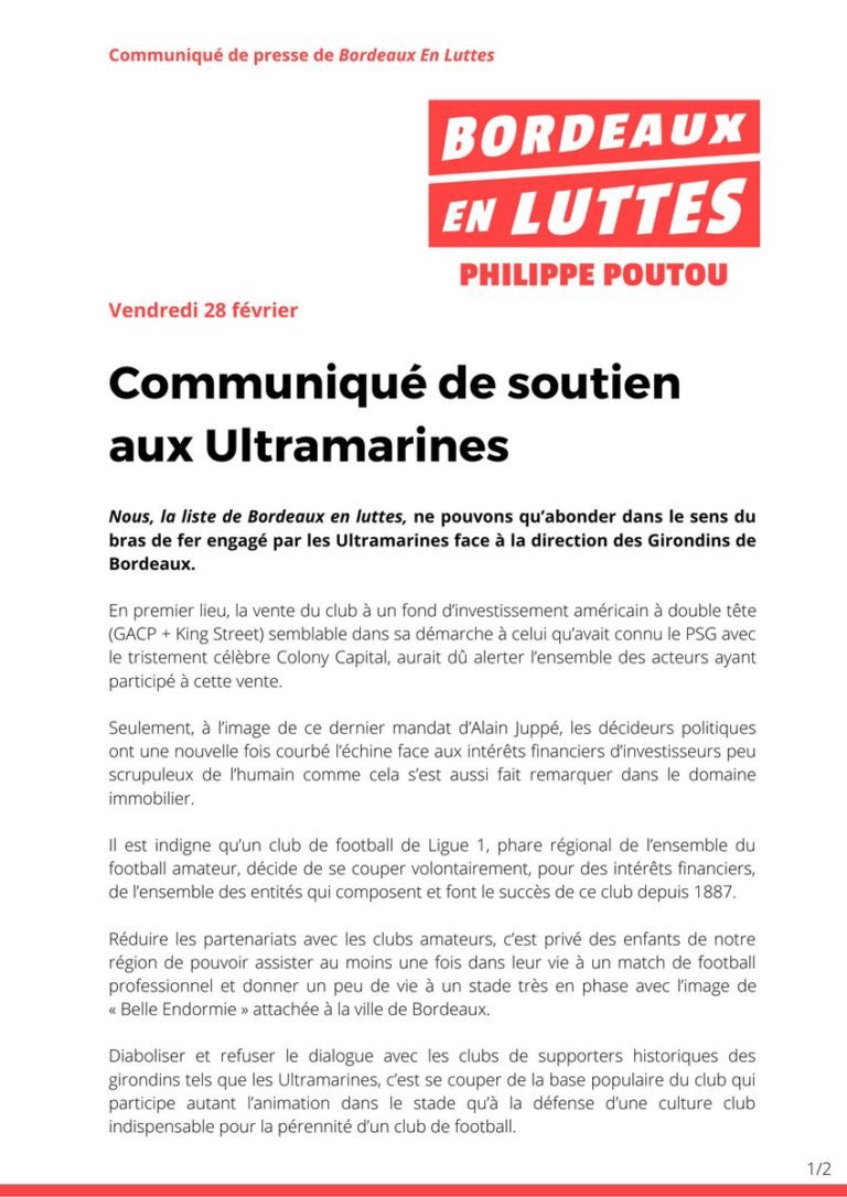 Cette fois-ci, c’est plus que des tweets, comme (re)demandé par les Ultramarines et leur porte-parole Florian Brunet. Ainsi, un des candidats à la mairie de Bordeaux pour les élections de mars 2020, Philippe Poutou, via sa liste « Bordeaux en Luttes », publie un communiqué de soutien aux Ultramarines pour dénoncer les dérives du FCGB à la sauce des fonds d’investissement américains (et surtout de King Street, désormais).