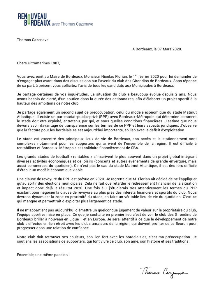 Un troisième candidat à la mairie de Bordeaux, Thomas Cazenave, via sa liste « Renouveau Bordeaux », a envoyé un courrier sur la situation des Girondins, en réponse à l’appel des Ultramarines.
