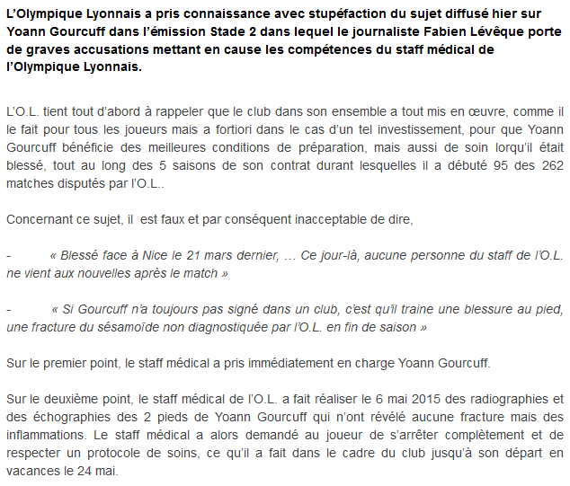 En réponse à la diffusion hier soir, sur France 2, d’un reportage révélant que Yoann Gourcuff souffrait toujours, et ce depuis 3 mois d’une fracture du sésamoïde (os du pied), l’Olympique Lyonnais a posté, sur son site officiel, un communiqué pour se défendre de toutes responsabilités.