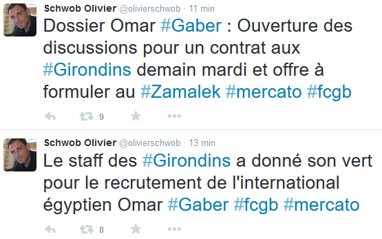 Selon le journaliste Olivier Schwob (Foot-Express), l’essai d’Omar Gaber a été concluant et Bordeaux va faire une offre à son club du Zamalek, où il est encore sous contrat jusqu’en juin 2018. Désireux de rejoindre le FCGB, le milieu droit international égyptien de 23 ans pourrait ainsi être la deuxième recrue estivale de 2015 à Bordeaux après le latéral serbe Milan Gajic.